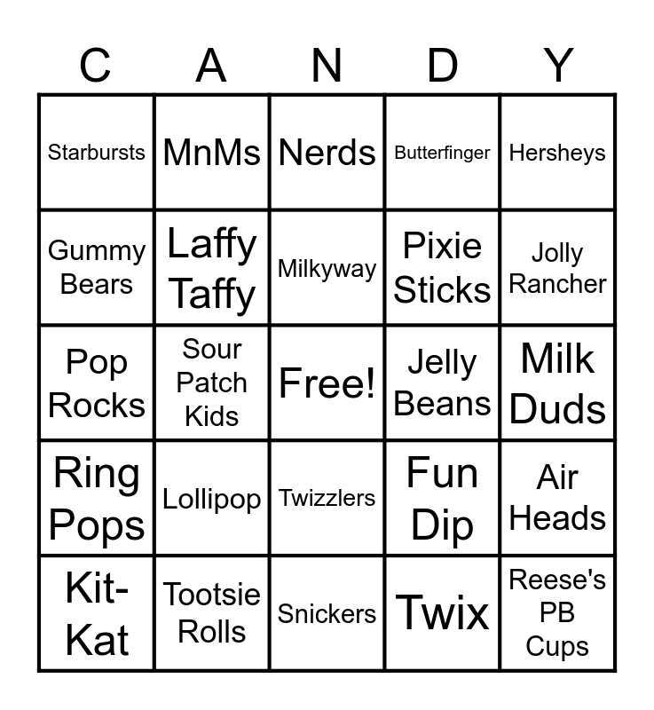 This bingo card has a free space and 25 words: Lollipop, Snickers, Milkyway, Kit-Kat, Hersheys, Starbursts, Gummy Bears, MnMs, Jelly Beans, Twizzlers, Pixie Sticks, Pop Rocks, Fun Dip, Air Heads, Laffy Taffy, Skittles, Milk Duds, Nerds, Jolly Rancher, Sour Patch Kids, Reese's PB Cups, Tootsie Rolls, Ring Pops, Butterfinger and Twix.