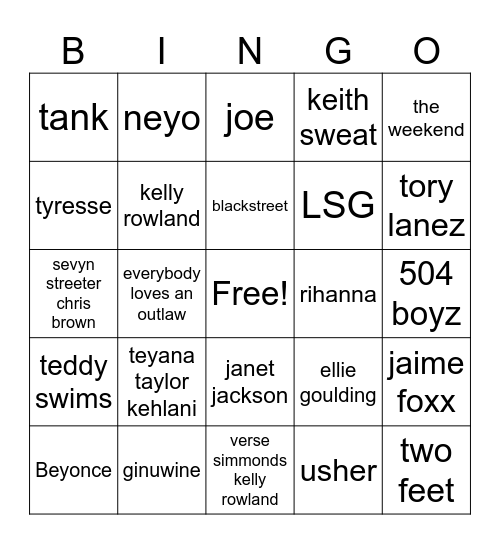 This bingo card has a free space and 29 words: Beyonce, miguel, everybody loves an outlaw, bryson tiller, tank, joe, kelly rowland, teyana taylor kehlani, rihanna, ginuwine, 504 boyz, two feet, verse simmonds kelly rowland, usher, tory lanez, avant, janet jackson, teddy swims, the weekend, sevyn streeter chris brown, ellie goulding, Htown, LSG, tyresse, keith sweat, neyo, jaime foxx, blackstreet and IMX.
