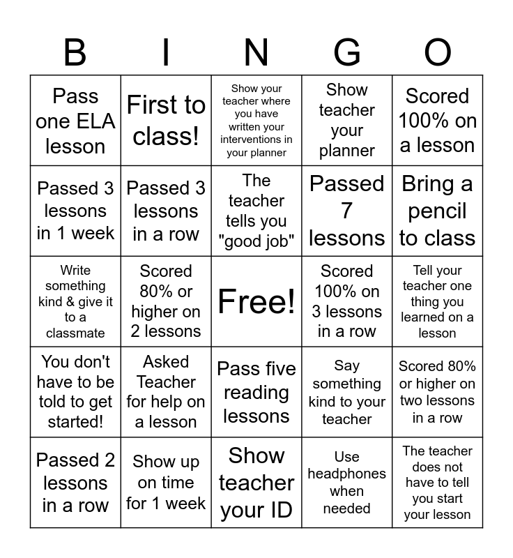 This bingo card has a free space and 24 words: Asked Teacher for help on a lesson, Show up on time for 1 week, The teacher tells you "good job", Passed 2 lessons in a row, Scored 100% on a lesson, Pass one ELA lesson, Passed 3 lessons in 1 week, First to class!, Scored 100% on 3 lessons in a row, Pass five reading lessons, Passed 7 lessons, Write something kind & give it to a classmate, Say something kind to your teacher, Scored 80% or higher on two lessons in a row, Passed 3 lessons in a row, Use headphones when needed, Tell your teacher one thing you learned on a lesson, Show your teacher where you have written your interventions in your planner, Bring a pencil to class, Scored 80% or higher on 2 lessons, The teacher does not have to tell you start your lesson, You don't have to be told to get started!, Show teacher your planner and Show teacher your ID.