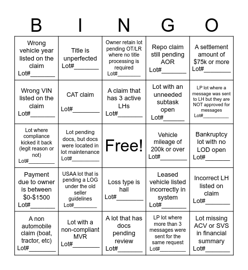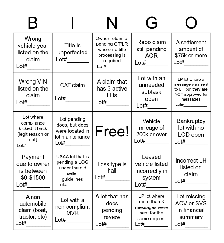 This bingo card has a free space and 24 words: USAA lot that is pending a LOG under the old seller guidelines Lot#________, Lot with a non-compliant MVR Lot#________, A claim that has 3 active LHs Lot#_______, A non automobile claim (boat, tractor, etc) Lot#________, A settlement amount of $75k or more Lot#________, Wrong vehicle year listed on the claim Lot#_______, Wrong VIN listed on the claim Lot#_______, Title is unperfected Lot#_______, Vehicle mileage of 200k or over Lot#________, Loss type is hail Lot#________, Lot with an unneeded subtask open Lot#______, Lot where compliance kicked it back (legit reason or not) Lot#_________, Leased vehicle listed incorrectly in system Lot#_______, Incorrect LH listed on claim Lot#_______, CAT claim Lot#________, LP lot where more than 3 messages were sent for the same request Lot#_________, Bankruptcy lot with no LOD open Lot#_______, Owner retain lot pending OT/LR where no title processing is required Lot#________, LP lot where a message was sent to LH but they are NOT approved for messages Lot#__________, Lot pending docs, but docs were located in lot maintenance Lot#_________, Lot missing ACV or SVS in financial summary Lot#_______, Payment due to owner is between $0-$1500 Lot#_______, Repo claim still pending AOR Lot#_______ and A lot that has docs pending review Lot#_______.