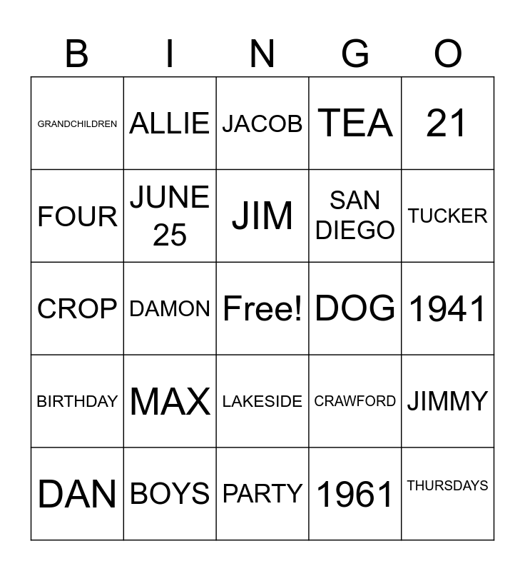 This bingo card has a free space and 24 words: MAX, BOYS, JIM, DAN, 21, GRANDCHILDREN, FOUR, ALLIE, DOG, LAKESIDE, SAN DIEGO, CROP, CRAWFORD, JIMMY, JUNE 25, 1961, 1941, JACOB, TUCKER, DAMON, THURSDAYS, BIRTHDAY, TEA and PARTY.