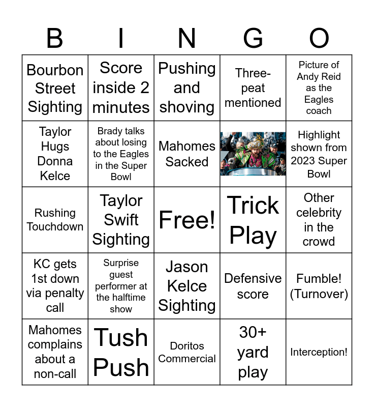 This bingo card has 1 images, a free space and 28 words: Mahomes complains about a non-call, 20+ yard Saquon rush, Taylor Swift Sighting, Challenge Flag, Bourbon Street Sighting, Pushing and shoving, Brady talks about losing to the Eagles in the Super Bowl, Surprise guest performer at the halftime show, Trick Play, Tush Push, Other celebrity in the crowd, Interception!, Doritos Commercial, 30+ yard play, Highlight shown from 2023 Super Bowl, Field Goal, Jason Kelce Sighting, KC gets 1st down via penalty call, Picture of Andy Reid as the Eagles coach, Rushing Touchdown, Defensive score, Bud Light Commercial, Taylor Hugs Donna Kelce, Three-peat mentioned, Score inside 2 minutes, Fumble! (Turnover), Mahomes Sacked and Hurts Sacked.