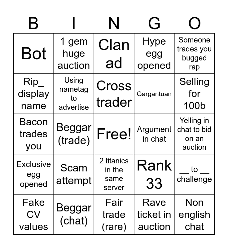 This bingo card has a free space and 24 words: Scam attempt, Beggar (chat), Cross trader, Fake CV values, Someone trades you bugged rap, Bot, Rip_ display name, 1 gem huge auction, Argument in chat, 2 titanics in the same server, Gargantuan, Bacon trades you, Rank 33, __ to __ challenge, Using nametag to advertise, Rave ticket in auction, Yelling in chat to bid on an auction, Clan ad, Selling for 100b, Beggar (trade), Non english chat, Exclusive egg opened, Hype egg opened and Fair trade (rare).