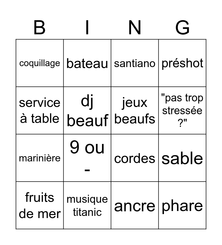 This bingo card has 16 words: musique titanic, sable, santiano, coquillage, marinière, bateau, cordes, ancre, service à table, dj beauf, fruits de mer, préshot, 9 ou -, "pas trop stressée ?", jeux beaufs and phare.