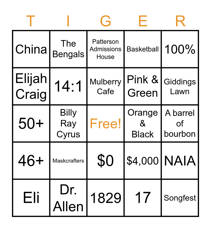 This bingo card has a free space and 26 words: $0, 17, Mulberry Cafe, Dr. Allen, 100%, China, Elijah Craig, The Bengals, A barrel of bourbon, $4,000, Pink & Green, 50+, NAIA, Eli, Billy Ray Cyrus, 10, Basketball, 46+, Patterson Admissions House, Songfest, Giddings Lawn, 1829, Orange & Black, Maskcrafters, 14:1 and Tiger.
