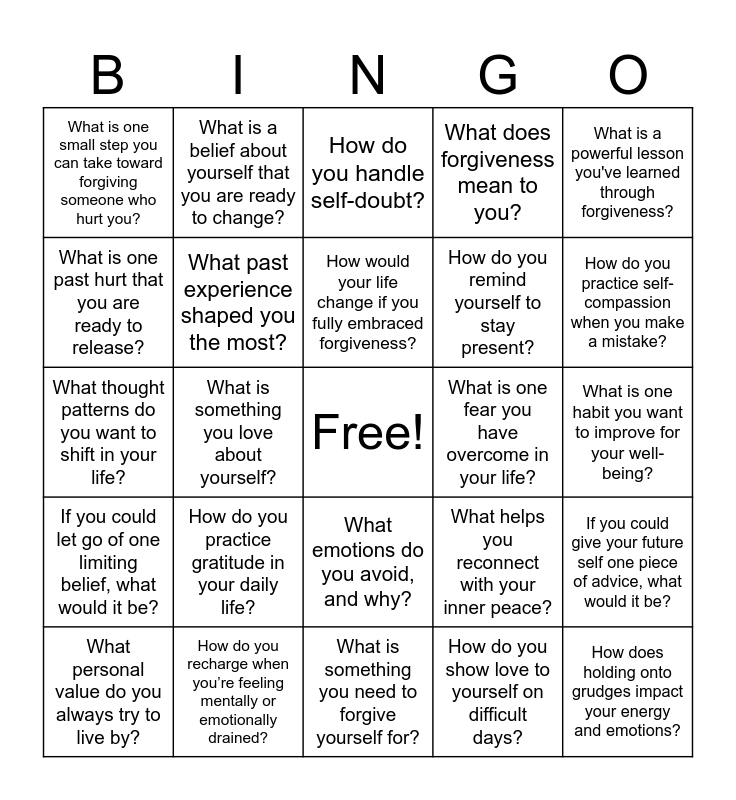 This bingo card has a free space and 59 words: What is something you’re grateful for today that you often take for granted?, How do you recharge when you’re feeling mentally or emotionally drained?, What does success mean to you beyond money and career?, If you could let go of one limiting belief, what would it be?, How do you show love to yourself on difficult days?, What habit would you like to develop that supports your well-being?, What past experience shaped you the most?, What’s a simple pleasure that always brings you joy?, How do you remind yourself to stay present?, What’s one way you can be kinder to yourself this week?, What does forgiveness mean to you?, How does forgiving others bring you inner peace?, What is one past hurt that you are ready to release?, Do you find it easier to forgive others or yourself? Why?, How can you practice self-compassion when dealing with past mistakes?, What is one small step you can take toward forgiving someone who hurt you?, How does holding onto grudges impact your energy and emotions?, What is a powerful lesson you've learned through forgiveness?, How can you shift your perspective to see challenges as opportunities for growth?, How would your life change if you fully embraced forgiveness?, What is one fear you have overcome in your life?, How do you handle self-doubt?, What personal value do you always try to live by?, If you could give your future self one piece of advice, what would it be?, What is one way you can step outside your comfort zone this week?, What do you need to hear today to feel encouraged?, How do you bring joy into other people’s lives?, What is something you need to remind yourself of more often?, How do you practice self-compassion when you make a mistake?, What kind of energy do you bring into a room?, What is something you’ve been avoiding but know you need to face?, When was the last time you truly felt aligned with your purpose?, How do you handle criticism, and what can you learn from it?, If you could describe your current mindset in one word, what would it be?, What is a belief about yourself that you are ready to change?, What is one lesson you’ve learned from a challenge in your life?, When do you feel most at peace?, What is something you love about yourself?, How do you show kindness to yourself daily?, What thought patterns do you want to shift in your life?, When was the last time you felt truly present in the moment?, How do you practice gratitude in your daily life?, What is one habit you want to improve for your well-being?, How do you recharge your energy after a stressful day?, What is something you’ve been resisting but need to accept?, What is one way you can deepen your connection with yourself?, What is something you have achieved that you are proud of?, How do you handle rejection or setbacks?, What emotions do you avoid, and why?, What is something you need to forgive yourself for?, What message would you give to your younger self?, How do you remind yourself that you are enough as you are?, What brings you the most joy in your life?, How do you define success for yourself?, What is one thing you want to let go of to grow?, What helps you reconnect with your inner peace?, How do you celebrate small victories in life?, What is one quality you admire in others and want to cultivate in yourself? and How do you stay true to yourself in difficult situations?.
