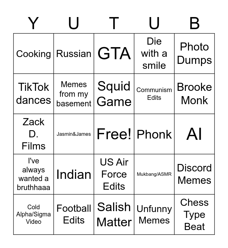 This bingo card has a free space and 24 words: Indian, Football Edits, Squid Game, Cold Alpha/Sigma Video, Photo Dumps, Cooking, TikTok dances, Russian, Phonk, US Air Force Edits, Communism Edits, Zack D. Films, Mukbang/ASMR, Discord Memes, Memes from my basement, Unfunny Memes, AI, GTA, Brooke Monk, Jasmin&James, Chess Type Beat, I've always wanted a bruthhaaa, Die with a smile and Salish Matter.