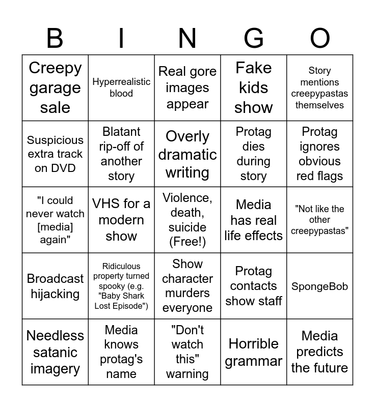 This bingo card has a free space and 34 words: Abrupt ending, Horrible grammar, File extension title, Deranged employee makes bad episode, Broadcast hijacking, Blatant rip-off of another story, Story mentions creepypastas themselves, Needless satanic imagery, Hyperrealistic blood, "I was an intern at...", Overly dramatic writing, Real gore images appear, Twist ending, "YOUR NEXT", Media has real life effects, Protag ignores obvious red flags, Media knows protag's name, "I could never watch [media] again", Ridiculous property turned spooky (e.g. "Baby Shark Lost Episode"), Protag contacts show staff, Show character murders everyone, The stopwatch ("it took 33.24 seconds..."), Creepy garage sale, "Not like the other creepypastas", "Don't watch this" warning, Media predicts the future, Fake kids show, Actually good grammar, Protag dies during story, Suspicious extra track on DVD, Finds media on the street, VHS for a modern show, SpongeBob and Out-of-story author comments.