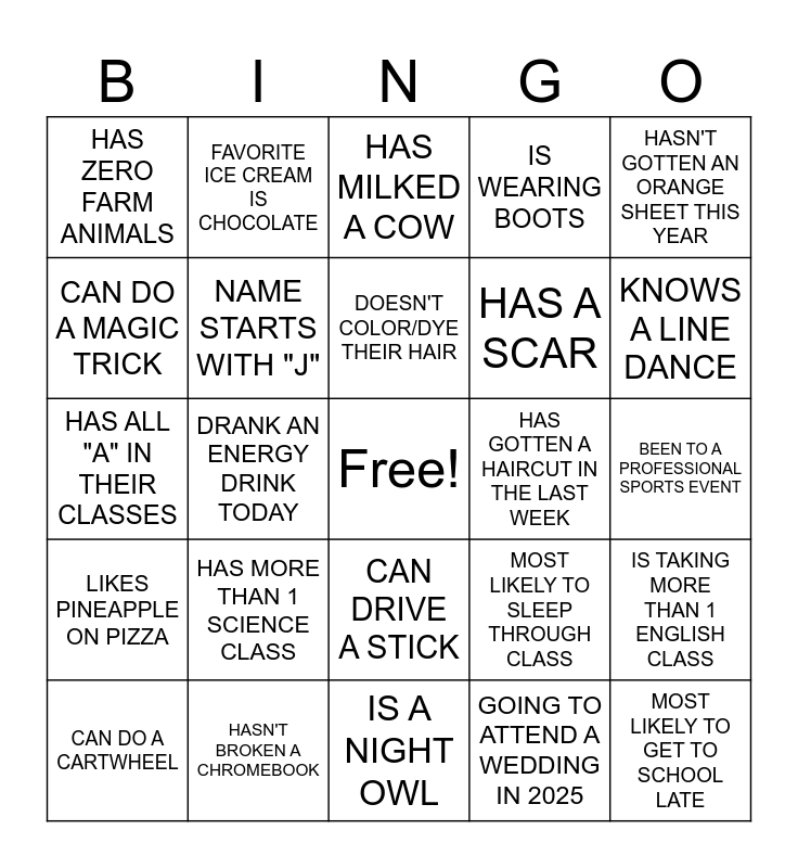 This bingo card has a free space and 24 words: HAS MORE THAN 1 SCIENCE CLASS, HASN'T BROKEN A CHROMEBOOK, DOESN'T COLOR/DYE THEIR HAIR, CAN DO A CARTWHEEL, HASN'T GOTTEN AN ORANGE SHEET THIS YEAR, HAS ZERO FARM ANIMALS, CAN DO A MAGIC TRICK, FAVORITE ICE CREAM IS CHOCOLATE, HAS GOTTEN A HAIRCUT IN THE LAST WEEK, CAN DRIVE A STICK, HAS A SCAR, HAS ALL "A" IN THEIR CLASSES, MOST LIKELY TO SLEEP THROUGH CLASS, IS TAKING MORE THAN 1 ENGLISH CLASS, NAME STARTS WITH "J", GOING TO ATTEND A WEDDING IN 2025, BEEN TO A PROFESSIONAL SPORTS EVENT, HAS MILKED A COW, KNOWS A LINE DANCE, DRANK AN ENERGY DRINK TODAY, MOST LIKELY TO GET TO SCHOOL LATE, LIKES PINEAPPLE ON PIZZA, IS WEARING BOOTS and IS A NIGHT OWL.