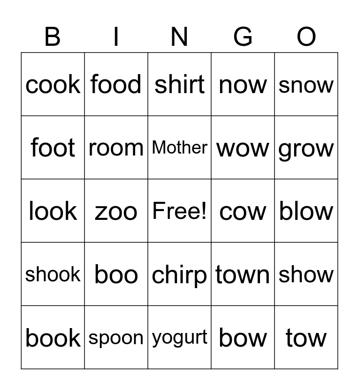 This bingo card has a free space and 24 words: book, boo, Mother, bow, snow, cook, food, shirt, cow, blow, look, room, town, show, foot, spoon, yogurt, now, grow, shook, zoo, chirp, wow and tow.