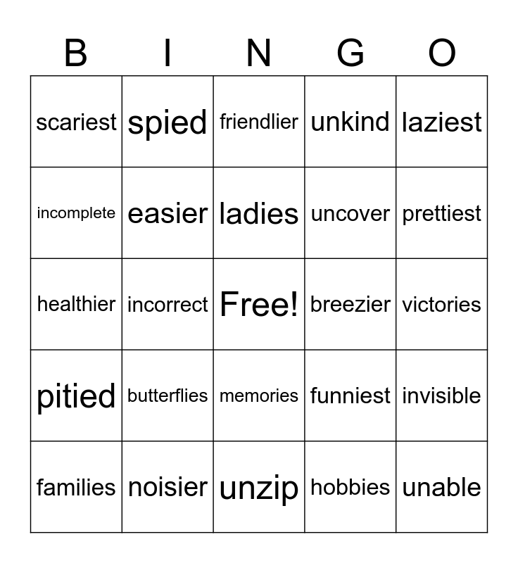 This bingo card has a free space and 34 words: tiniest, hobbies, copied, countries, pitied, easier, laziest, families, spied, happiest, ladies, friendlier, studied, busier, breezier, prettiest, noisier, healthier, butterflies, funniest, memories, terrified, scariest, victories, unzip, unable, unkind, unimportant, uncover, incomplete, independent, incorrect, invisible and inactive.