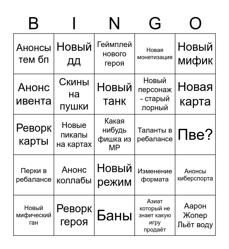 This bingo card has 34 words: Аарон Жопер Льёт воду, Азиат который не знает какую игру продаёт, Новый скин на кири/юно/мерсу, Реколоры, Перки в ребалансе, Скины на пушки, Новый мифик, Новый мифический ган, Новый дд, Новый сап, Новый танк, Геймплей нового героя, Новая косметика, Лгбт пропаганда, Таланты в ребалансе, Новая карта, Реворк героя, Реворк карты, Анонс коллабы, Изменение формата, Новый режим, Реворк режима, Анонсы тем бп, Пве?, Баны, Какая нибудь фишка из МР, Новая монетизация, Изменение системы рейтинга, Новый персонаж - старый лорный, Анонс ивента, Разраб - ноунейм, Новые пикапы на картах, Анонсы киберспорта and Скины киберспорта.