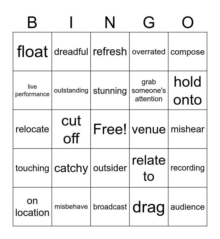 This bingo card has a free space and 47 words: appeal to, audience, be worth seeing, broadcast, catchy, come out, dreadful, let-down, live performance, long-running, outstanding, overrated, recording, relate to, remake, star in, stunning, venue, break-up, compose, cut off, drag, float, grab someone's attention, hit the big time, hold onto, on location, outrageous, outsider, touching, turn up, to begin with, megabyte, megacity, megastar, misbehave, mishear, misunderstood, overcrowded, overestimate, rebuild, refresh, relocate, rethink, underestimate, underpaid and underrated.