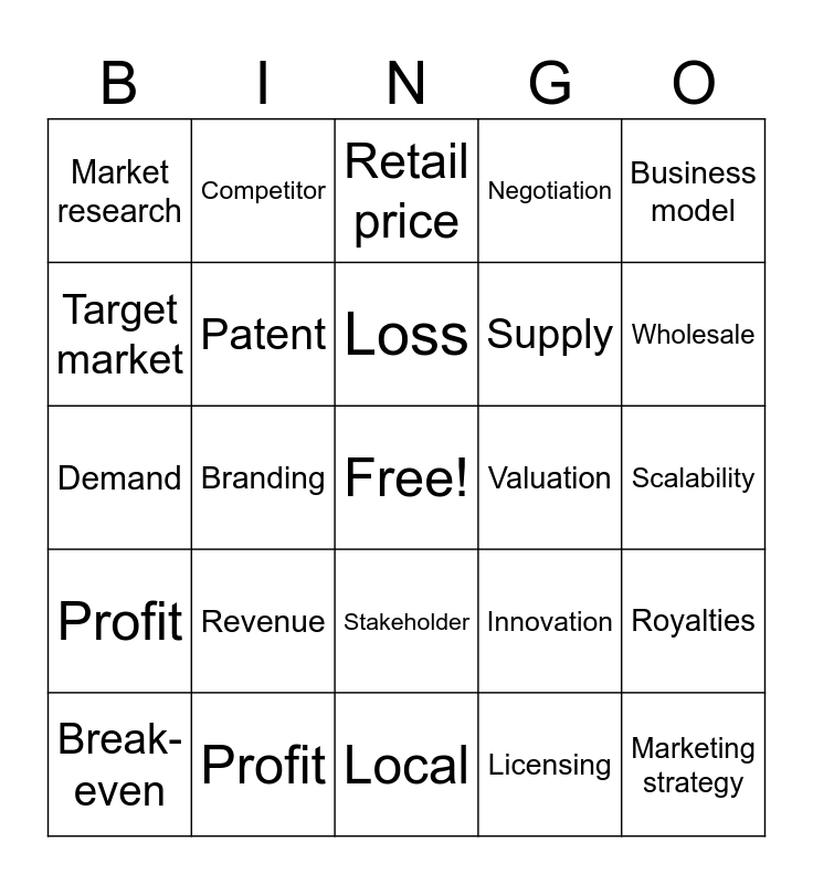 This bingo card has a free space and 24 words: Revenue, Profit, Loss, Break-even, Business model, Market research, Target market, Competitor, Valuation, Stakeholder, Supply, Demand, Innovation, Royalties, Patent, Licensing, Scalability, Retail price, Wholesale, Branding, Marketing strategy, Profit, Negotiation and Local.