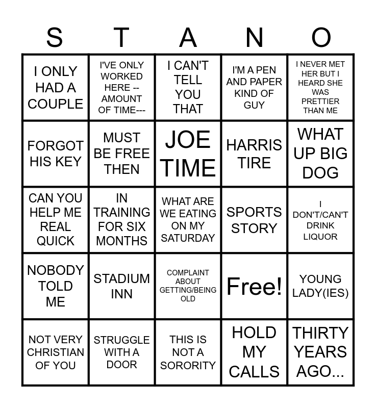 This bingo card has 25 words: STADIUM INN, THIS IS NOT A SORORITY, JOE TIME, NOT VERY CHRISTIAN OF YOU, I NEVER MET HER BUT I HEARD SHE WAS PRETTIER THAN ME, I ONLY HAD A COUPLE, FORGOT HIS KEY, I'VE ONLY WORKED HERE --AMOUNT OF TIME---, SPORTS STORY, COMPLAINT ABOUT GETTING/BEING OLD, HARRIS TIRE, CAN YOU HELP ME REAL QUICK, Free!, YOUNG LADY(IES), MUST BE FREE THEN, THIRTY YEARS AGO..., I DON'T/CAN'T DRINK LIQUOR, I CAN'T TELL YOU THAT, WHAT UP BIG DOG, IN TRAINING FOR SIX MONTHS, WHAT ARE WE EATING ON MY SATURDAY, STRUGGLE WITH A DOOR, NOBODY TOLD ME, I'M A PEN AND PAPER KIND OF GUY and HOLD MY CALLS.