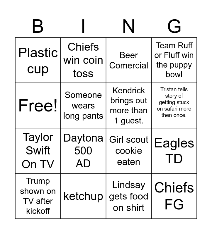 This bingo card has 16 words: ketchup, Eagles TD, Beer Comercial, Plastic cup, Taylor Swift On TV, Chiefs win coin toss, Girl scout cookie eaten, Lindsay gets food on shirt, Free!, Someone wears long pants, Trump shown on TV after kickoff, Team Ruff or Fluff win the puppy bowl, Daytona 500 AD, Tristan tells story of getting stuck on safari more then once., Kendrick brings out more than 1 guest. and Chiefs FG.