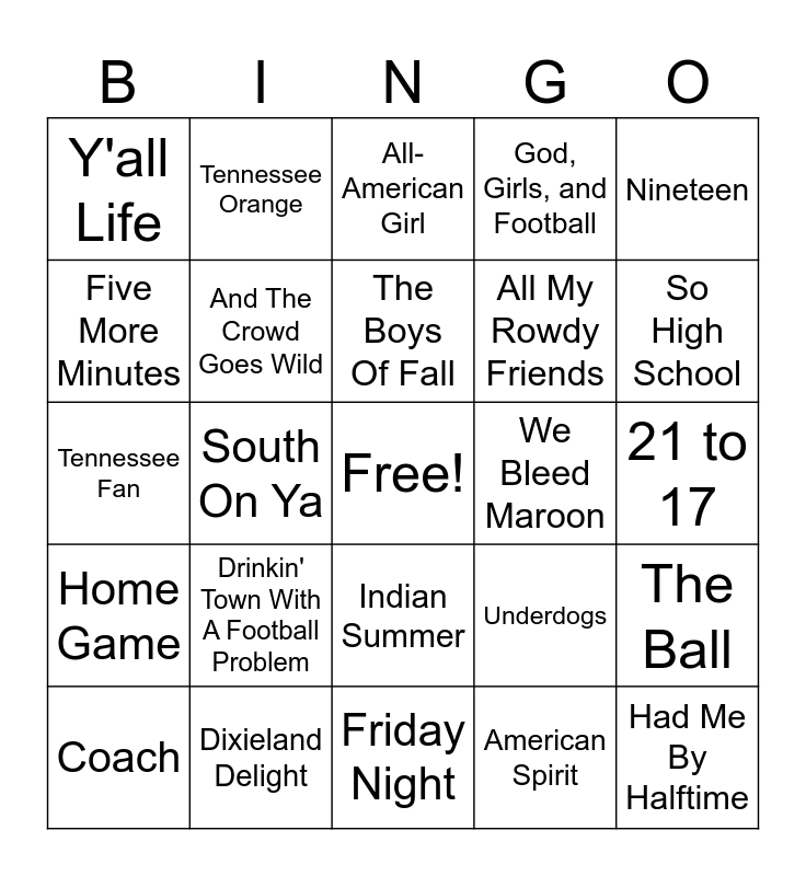 This bingo card has a free space and 24 words: Drinkin' Town With A Football Problem, Dixieland Delight, The Boys Of Fall, Coach, Nineteen, Y'all Life, Five More Minutes, Tennessee Orange, We Bleed Maroon, Indian Summer, All My Rowdy Friends, Tennessee Fan, Underdogs, The Ball, And The Crowd Goes Wild, American Spirit, 21 to 17, All-American Girl, So High School, South On Ya, Had Me By Halftime, Home Game, God, Girls, and Football and Friday Night.