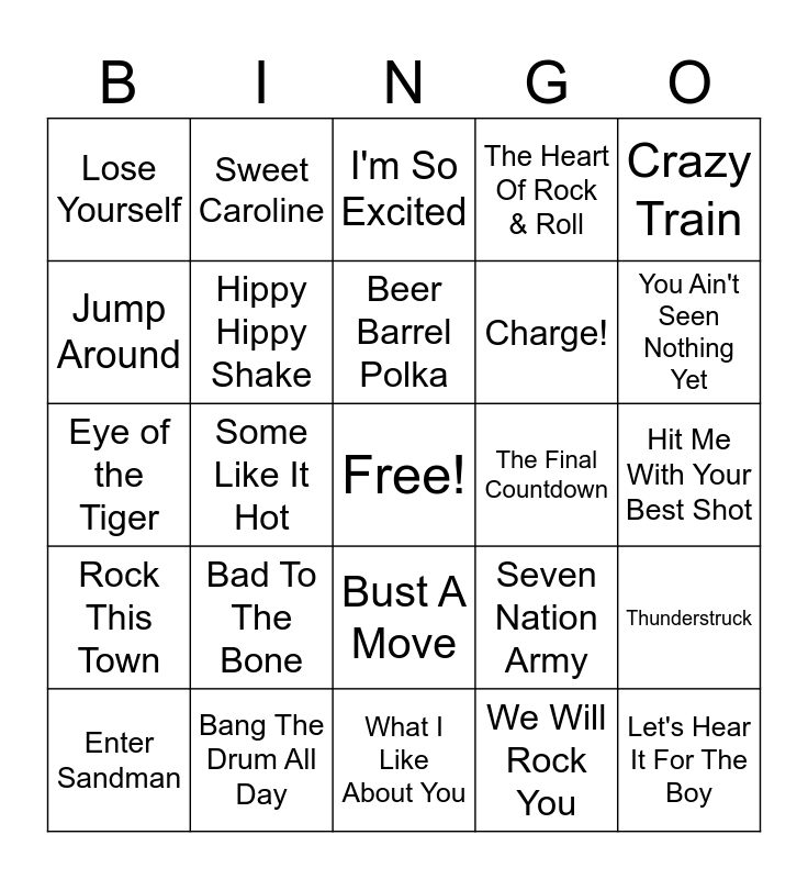 This bingo card has a free space and 24 words: Bad To The Bone, Bang The Drum All Day, Beer Barrel Polka, Enter Sandman, Crazy Train, Lose Yourself, Jump Around, Sweet Caroline, The Final Countdown, Bust A Move, Charge!, Eye of the Tiger, Seven Nation Army, Thunderstruck, Hippy Hippy Shake, We Will Rock You, Hit Me With Your Best Shot, I'm So Excited, You Ain't Seen Nothing Yet, Some Like It Hot, Let's Hear It For The Boy, Rock This Town, The Heart Of Rock & Roll and What I Like About You.