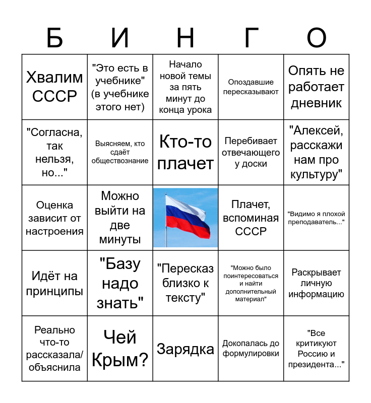 This bingo card has a free space and 74 words: Справочник Баранова, "Некоторые вещи просто нужно знать, мы живём в России", Начало новой темы за пять минут до конца урока, Даёт тест на 15 минут, забирает через 10, ЧУВАШИЯ, Обсуждаем чью-то национальность, Обсуждаем чей-то внешний вид, Слушаем советские песни на перемене, Реально что-то рассказала/объяснила, Говорим про Шамана, Говорим про СВО, "Мда, ребят...", Кто-то плачет, "Согласна, так нельзя, но...", Замечание по поводу напитков, Можно выйти на две минуты, Упоминание Дани (Даня не в классе), "Алексей, расскажи нам про культуру", Обсуждаем Конституцию, Оценка зависит от настроения, Выясняем, кто сдаёт обществознание, "Это есть в учебнике" (в учебнике этого нет), Опоздавшие пересказывают, Упоминание детей из другого корпуса, "Все критикуют Россию и президента...", "Учебники должны быть закрыты", Яся отвечает у доски на обществознании, Вздохи, Оскорбление по поводу интеллекта, Рассказ про своё детство, Опять не работает дневник, Спрашивает у сдающих про подготовку, Упоминает практикум, Все спорят, "Опять меня уносит...", Докопалась до формулировки, "Саша, тебе как журналисту это полезно", "В любой другой стране вы будете чужими", "Это выделено жирным шрифтом", "На пятёрку надо рассказать у доски", Зарядка, Чей Крым?, У Бекарыса двоечка по приколу, Рандомно весь урок докапывалась до одного человека, На перемене Алексей за главного, Хвалим СССР, Опять всех пересадила, "Базу надо знать", "Для себя пометки делайте", Работа по вопросам к параграфу, Ловит по школе с просьбой показать тетрадь, "У нас уроки начинаются в 8:30", "Видимо я плохой преподаватель...", "Лёш/Андрей, ну...", "Не хочется играть в демократию", "А что, если я...", "Пересказ близко к тексту", Сама себе противоречит, "Вот вы жалуетесь на учебник...", Раскрывает личную информацию, Перебивает отвечающего у доски, Посмеялась, Идёт на принципы, "Госпожа/Господин", Плачет, вспоминая СССР, "Спрашивать всех буду одинаково", "Проведём мостик между историей и общество-знанием...", "Меня это не волнует", "Можно было поинтересоваться и найти дополнительный материал", Редиски, "Да, я вредная", "А что делать?", Весь урок намекает на конфликт с кем-то and "Это надо отметить/зафиксировать".