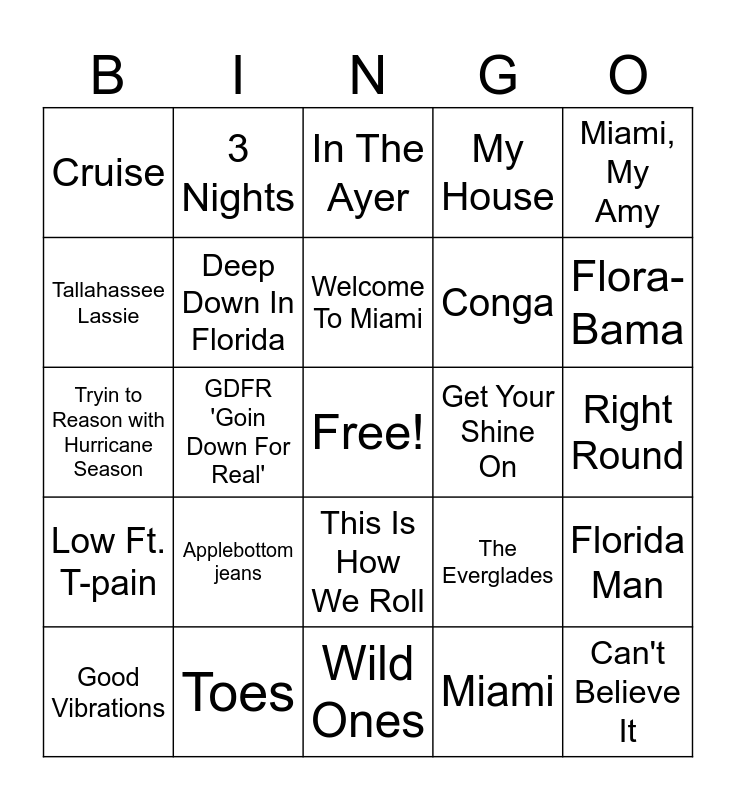 This bingo card has a free space and 24 words: Applebottom jeans, Toes, Welcome To Miami, Good Vibrations, Miami, My Amy, Cruise, Tallahassee Lassie, 3 Nights, Get Your Shine On, This Is How We Roll, Conga, Tryin to Reason with Hurricane Season, The Everglades, Florida Man, Deep Down In Florida, Miami, Right Round, In The Ayer, Flora-Bama, GDFR 'Goin Down For Real', Can't Believe It, Low Ft. T-pain, My House and Wild Ones.