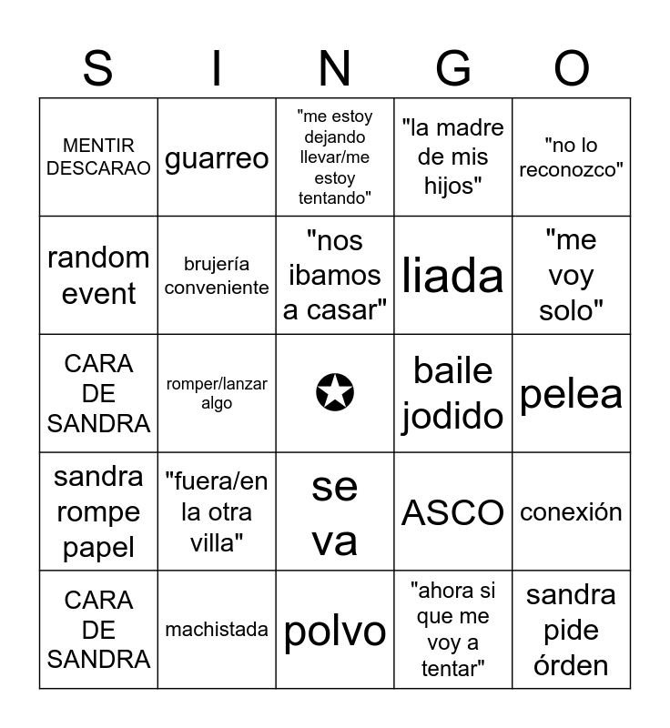 This bingo card has a free space and 31 words: polvo, "porque me sale/porque lo he sentido", romper/lanzar algo, alarma, MENTIR DESCARAO, "me estoy dejando llevar/me estoy tentando", brujería conveniente, ASCO, baile jodido, "ahora si que me voy a tentar", pelea, sandra pide órden, insultar a la pareja, cámara persigue a alguien, "me voy solo", beso, conexión, "fuera/en la otra villa", sandra rompe papel, se va, "no lo reconozco", llorar, CARA DE SANDRA, guarreo, liada, random event, "la madre de mis hijos", CARA DE SANDRA, machistada, "nos ibamos a casar" and ABSOLUTO CRINGE.