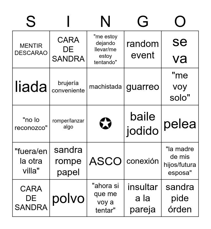 This bingo card has a free space and 30 words: polvo, "porque me sale/porque lo he sentido", romper/lanzar algo, alarma, MENTIR DESCARAO, "me estoy dejando llevar/me estoy tentando", brujería conveniente, ASCO, baile jodido, "ahora si que me voy a tentar", pelea, sandra pide órden, insultar a la pareja, cámara persigue a alguien, "me voy solo", beso, conexión, "fuera/en la otra villa", sandra rompe papel, se va, "no lo reconozco", llorar, CARA DE SANDRA, guarreo, liada, random event, "la madre de mis hijos/futura esposa", CARA DE SANDRA, machistada and ABSOLUTO CRINGE.