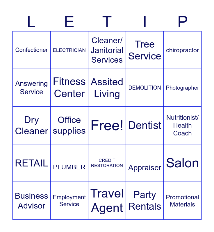 This bingo card has a free space and 24 words: PLUMBER, Employment Service, Assited Living, Business Advisor, chiropractor, Confectioner, Answering Service, ELECTRICIAN, Dentist, CREDIT RESTORATION, DEMOLITION, Dry Cleaner, Appraiser, Salon, Fitness Center, Party Rentals, Nutritionist/ Health Coach, Cleaner/ Janitorial Services, Photographer, Office supplies, Promotional Materials, RETAIL, Tree Service and Travel Agent.