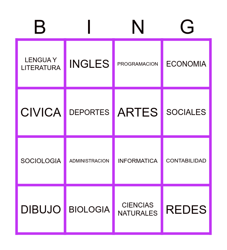 This bingo card has 24 words: MATEMATICAS, ESPAÑOL, SOCIALES, FISICA, CIVICA, LENGUA Y LITERATURA, DEPORTES, INGLES, BIOLOGIA, HISTORIA, SOCIOLOGIA, INFORMATICA, PSICOLOGIA, QUIMICA, ARTES, MUSICA, CIENCIAS NATURALES, PROGRAMACION, ADMINISTRACION, CONTABILIDAD, DIBUJO, REDES, ECONOMIA and ESTADISTICAS.