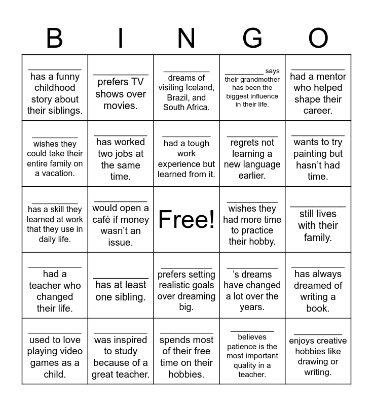 This bingo card has a free space and 80 words: __________ took a trip to Japan and loved the food., __________ went on a solo trip and found it life-changing., __________ dreams of visiting Iceland, Brazil, and South Africa., __________ always packs their suitcase at the last minute., __________ tried an exotic dish while traveling and actually liked it., __________ once missed a flight and had to sleep at the airport., __________ has traveled to another country., __________ prefers road trips over flying., __________ has stayed in a hostel., __________ prefers mountains over beaches., __________ comes from a very large family with lots of cousins., __________ has a family tradition of watching movies every Sunday., __________ says their grandmother has been the biggest influence in their life., __________ has a funny childhood story about their siblings., __________ always celebrates birthdays with a big family meal., __________ wishes they could take their entire family on a vacation., __________ has a unique family tradition that others find interesting., __________ has at least one sibling., __________ is the youngest child in their family., __________ still lives with their family., __________ learned an important life lesson from a past job., __________ had a mentor who helped shape their career., __________ has a skill they learned at work that they use in daily life., __________ had a tough work experience but learned from it., __________ has worked two jobs at the same time., __________ prefers working in a team rather than alone., __________ has experience working remotely., __________ likes flexible work environments over structured ones., __________ has been promoted before., __________ worked as a cashier in their first job., __________ wants to try painting but hasn’t had time., __________ got into photography by accident., __________ spends most of their free time on their hobbies., __________ turned their hobby into a side business., __________ used to love playing video games as a child., __________ wishes they had more time to practice their hobby., __________ has taken a workshop to improve their skills., __________ has a hobby that keeps them physically active., __________ prefers outdoor hobbies over indoor ones., __________ enjoys creative hobbies like drawing or writing., __________ discovers new music through Spotify playlists., __________ read a book that changed their life., __________ dreams of meeting their favorite actor., __________ attended a live concert and it was amazing., __________ watches movies to relax., __________ prefers TV shows over movies., __________ has binge-watched an entire show in one day., __________ listens to podcasts every day., __________has played a musical instrument before., __________ enjoys reading non-fiction books., __________ has always dreamed of writing a book., __________ would open a café if money wasn’t an issue., __________ ’s dreams have changed a lot over the years., __________ has already achieved a dream they once had., __________ is inspired by their parents to follow their dreams., __________ once thought their dream was impossible, but they made it happen., __________ is actively working toward their dream right now., __________ believes that dreams change over time., __________ has kept a dream journal before., __________ prefers setting realistic goals over dreaming big., __________ regrets not learning a new language earlier., __________ made a decision they wish they could take back., __________ learned an important lesson from a past mistake., __________ would go back and change one thing if they could., __________ has apologized for something they regretted., __________ wishes they had taken a certain opportunity., __________ believes it’s possible to live without regrets., __________ believes regrets help us grow., __________ once said "yes" to something they regretted., __________ believes everything happens for a reason., __________ had a teacher who changed their life., __________ was inspired to study because of a great teacher., __________ learned an unforgettable lesson from a teacher., __________ had a teacher who made learning fun., __________ wishes they could thank their favorite teacher., __________ has thought about becoming a teacher., __________ believes patience is the most important quality in a teacher., __________ actually enjoyed school., __________ had a very strict teacher in school. and __________ once had a teacher who completely changed their perspective..