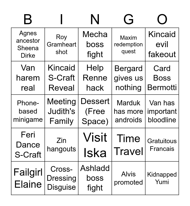 This bingo card has a free space and 33 words: Bracer Gray Backstory, No Nina Reveal, Meeting Judith's Family, Mare Human Form, Feri Dance S-Craft, Kincaid S-Craft Reveal, Kincaid evil fakeout, Failgirl Elaine, Roy Gramheart shot, "No, I'M the True Mare!", Help Renne hack, Mecha boss fight, Kasim boss fight, Kasim does nothing, Marduk has more androids, Card Boss Bermotti, Cross-Dressing Disguise, Phone-based minigame, Zin hangouts, Time Travel, Visit Iska, Sheena Dirke Lives, Agnes ancestor Sheena Dirke, Van has important bloodline, Ashladd boss fight, Kidnapped Yumi, Maxim redemption quest, Bergard gives us nothing, Van harem real, Gratuitous Francais, Van's truck damaged, Alvis promoted and Another returning bracer.