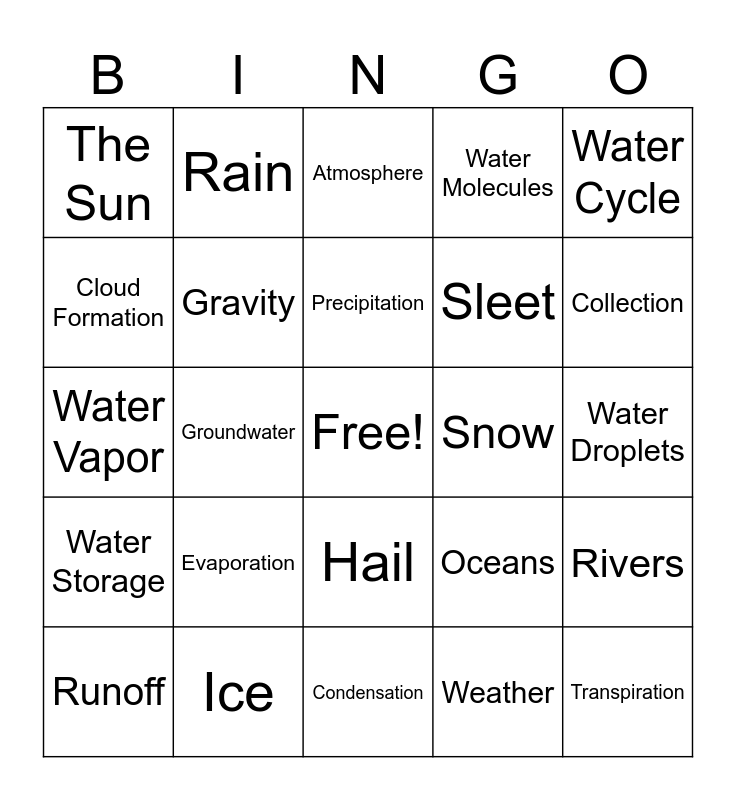 This bingo card has a free space and 25 words: Evaporation, Condensation, Precipitation, Runoff, Water Cycle, The Sun, Cloud Formation, Rain, Snow, Hail, Sleet, Water Vapor, Oceans, Rivers, Gravity, Thermal Energy, Water Droplets, Atmosphere, Collection, Groundwater, Transpiration, Ice, Water Storage, Water Molecules and Weather.