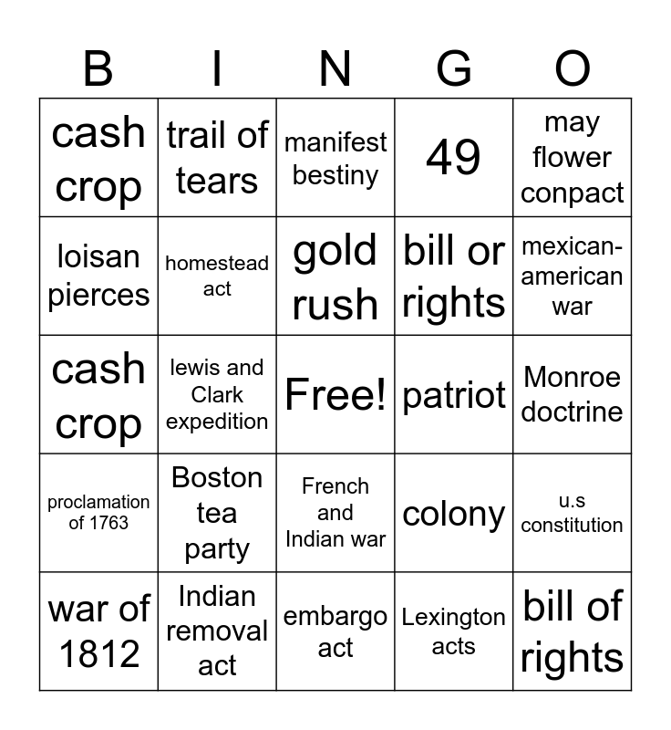 This bingo card has a free space and 24 words: Boston tea party, Indian removal act, gold rush, war of 1812, may flower conpact, cash crop, loisan pierces, trail of tears, patriot, French and Indian war, bill or rights, cash crop, colony, u.s constitution, homestead act, Lexington acts, Monroe doctrine, manifest bestiny, mexican-american war, lewis and Clark expedition, bill of rights, proclamation of 1763, 49 and embargo act.