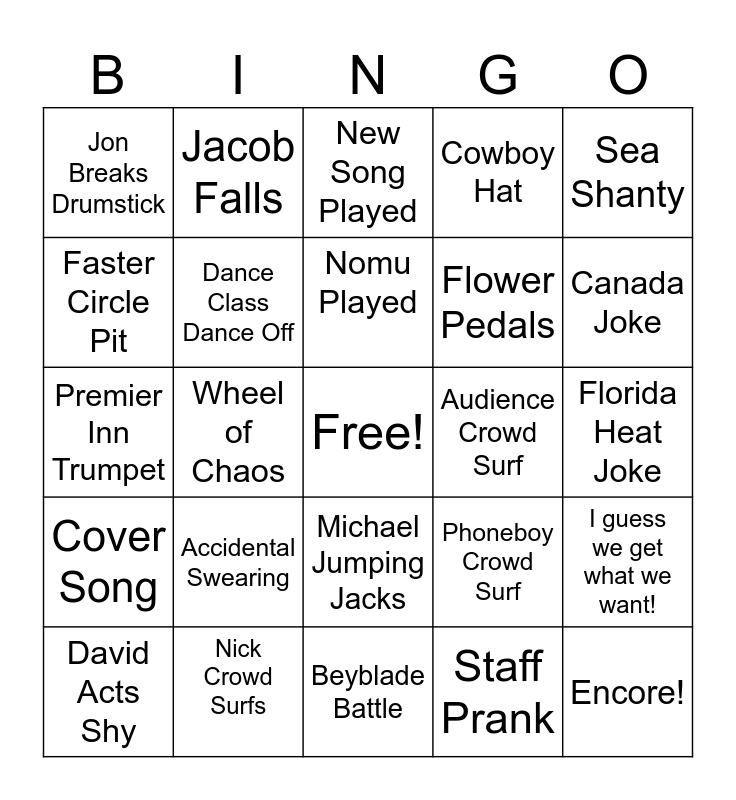This bingo card has a free space and 24 words: Accidental Swearing, Nick Crowd Surfs, Nomu Played, David Acts Shy, Sea Shanty, Jon Breaks Drumstick, Faster Circle Pit, Jacob Falls, Audience Crowd Surf, Michael Jumping Jacks, Flower Pedals, Premier Inn Trumpet, Phoneboy Crowd Surf, I guess we get what we want!, Dance Class Dance Off, Staff Prank, Florida Heat Joke, New Song Played, Canada Joke, Wheel of Chaos, Encore!, Cover Song, Cowboy Hat and Beyblade Battle.