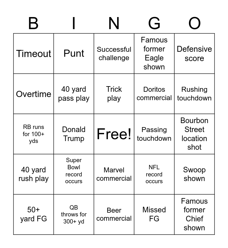This bingo card has a free space and 34 words: Late hit happens to Patrick Mahomes, Missed FG, Taylor Swift, Tush Push successful, 40 yard rush play, 40 yard pass play, Defensive score, 50+ yard FG, Punt, 2 point conversion, Trick play, Successful challenge, Fumble, INT, Passing touchdown, Rushing touchdown, QB throws for 300+ yd, RB runs for 100+ yds, Super Bowl record occurs, NFL record occurs, Marvel commercial, Kneel down, Timeout, Bourbon Street location shot, Beer commercial, Famous former Chief shown, Famous former Eagle shown, Previous Super Bowl highlight, Doritos commercial, Overtime, FOX TV show promotion, Donald Trump, Swoop shown and K.C. Wolf shown.