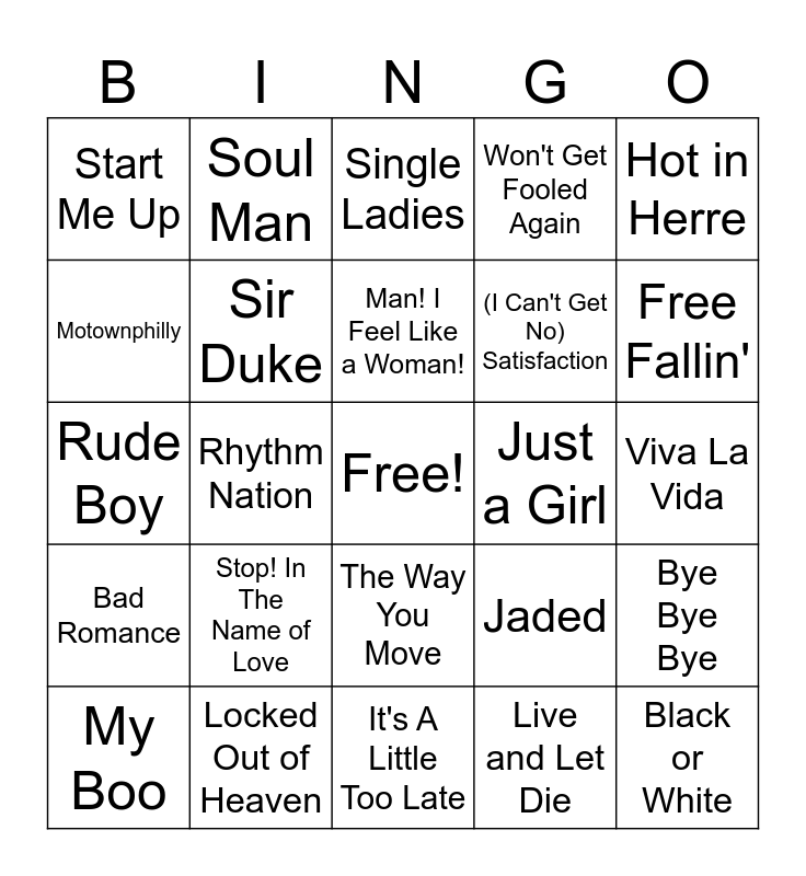 This bingo card has a free space and 52 words: Billie Jean, Black or White, Tuckered Out, It's A Little Too Late, Stop! In The Name of Love, Baby Love, Soul Man, Everybody Needs Somebody to Love, Motownphilly, My Girl, Sir Duke, Turn the Beat Around, Bye Bye Bye, Jaded, Walk This Way, Beautiful Day, Man! I Feel Like a Woman!, Just a Girl, All for You, Hot in Herre, Rhythm Nation, Live and Let Die, Start Me Up, (I Can't Get No) Satisfaction, Can't Feel My Face, Let's Go Crazy, Purple Rain, I Won't Back Down, Free Fallin', Born to Run, Who Are You, Won't Get Fooled Again, I Gotta Feeling, Vogue, Like a Prayer, Single Ladies, Locked Out of Heaven, Give It Away, Teenage Dream, Firework, Get Ur Freak On, Viva La Vida, Bad Romance, This Love, The Way You Move, Whenever, Whenever, Blinding Lights, Rude Boy, Diamonds, U Got It Bad, My Boo and Rock Your Body.