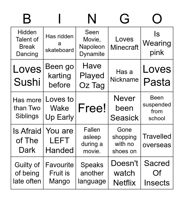 This bingo card has a free space and 24 words: You are LEFT Handed, Favourite Fruit is Mango, Have Played Oz Tag, Guilty of of being late often, Is Wearing pink, Hidden Talent of Break Dancing, Loves Sushi, Has ridden a skateboard, Never been Seasick, Fallen asleep during a movie., Has a Nickname, Has more than Two Siblings, Gone shopping with no shoes on, Travelled overseas, Been go karting before, Doesn't watch Netflix, Been suspended from school, Seen Movie, Napoleon Dynamite, Loves Pasta, Loves to Wake Up Early, Sacred Of Insects, Is Afraid of The Dark, Loves Minecraft and Speaks another language.