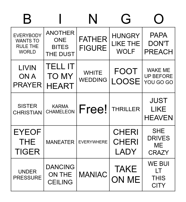 This bingo card has a free space and 54 words: BILLIE JEAN, EYEOF THE TIGER, DANGER ZONE, MATERIAL GIRL, EVERYWHERE, TALKING IN YOUR SLEEP, HUNGRY LIKE THE WOLF, SUSSUDIO, LIVIN ON A PRAYER, TRUE COLORS, EVERYBODY WANTS TO RULE THE WORLD, COME ON EILEEN, DANCING ON THE CEILING, UNDER PRESSURE, SWEET CHILD O' MINE, MANIAC, WE BUILT THIS CITY, FOOT LOOSE, WHEN DOVES CRY, JUST LIKE HEAVEN, CHERI CHERI LADY, IT MUST HAVE BEEN LOVE, THRILLER, PAPA DON'T PREACH, TOTAL ECLPISE OF THE HEART, ANOTHER ONE BITES THE DUST, HOW WILL I KNOW, THIS IS THE DAY, RASPBERRY BERET, TAKE ON ME, DON'T YOU WANT ME, WHATS LOVE GOT TO DO WITH IT, VIDEO KILLED THE RADIO STORE, NEED YOU TONIGHT, FATHER FIGURE, ALL NIGHT LONG, SISTER CHRISTIAN, SHE DRIVES ME CRAZY, I'M SO EXCITED, TELL IT TO MY HEART, HERE I GO AGAIN, WEST END GIRLS, DON'T YOU (FORGET ABOUT ME), WALKING ON SUNSHINE, MANEATER, BLUE MONDAY, LETS GROOVE, NEVER GONNA GIVE YOU UP, WHITE WEDDING, KARMA CHAMELEON, WAKE ME UP BEFORE YOU GO GO, NOTHINGS GONNA STOP US NOW, WORD UP and SWEET DREAMS.