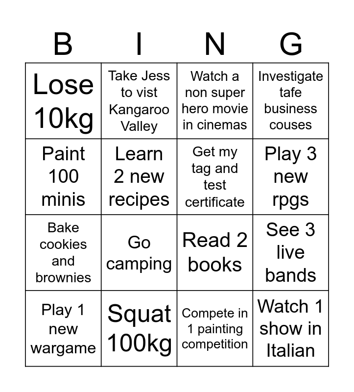This bingo card has 16 words: Squat 100kg, See 3 live bands, Watch a non super hero movie in cinemas, Lose 10kg, Bake cookies and brownies, Take Jess to vist Kangaroo Valley, Read 2 books, Compete in 1 painting competition, Paint 100 minis, Learn 2 new recipes, Play 1 new wargame, Investigate tafe business couses, Go camping, Play 3 new rpgs, Get my tag and test certificate and Watch 1 show in Italian.