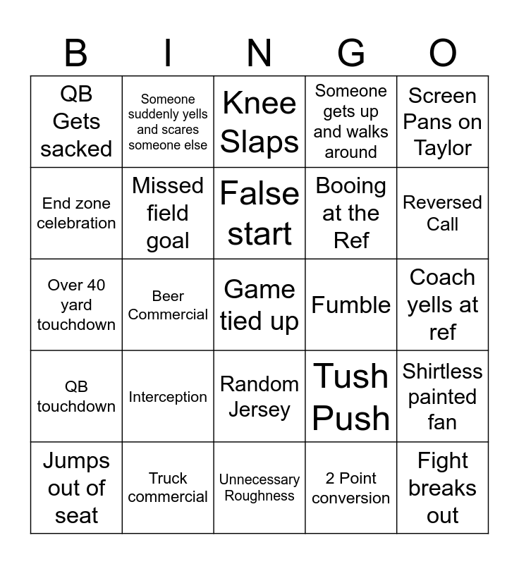 This bingo card has 25 words: Interception, Unnecessary Roughness, False start, Jumps out of seat, Screen Pans on Taylor, QB Gets sacked, End zone celebration, Someone suddenly yells and scares someone else, Fumble, Random Jersey, Booing at the Ref, Over 40 yard touchdown, Tush Push, Shirtless painted fan, Missed field goal, Fight breaks out, Coach yells at ref, Knee Slaps, Reversed Call, Beer Commercial, Game tied up, Truck commercial, QB touchdown, Someone gets up and walks around and 2 Point conversion.