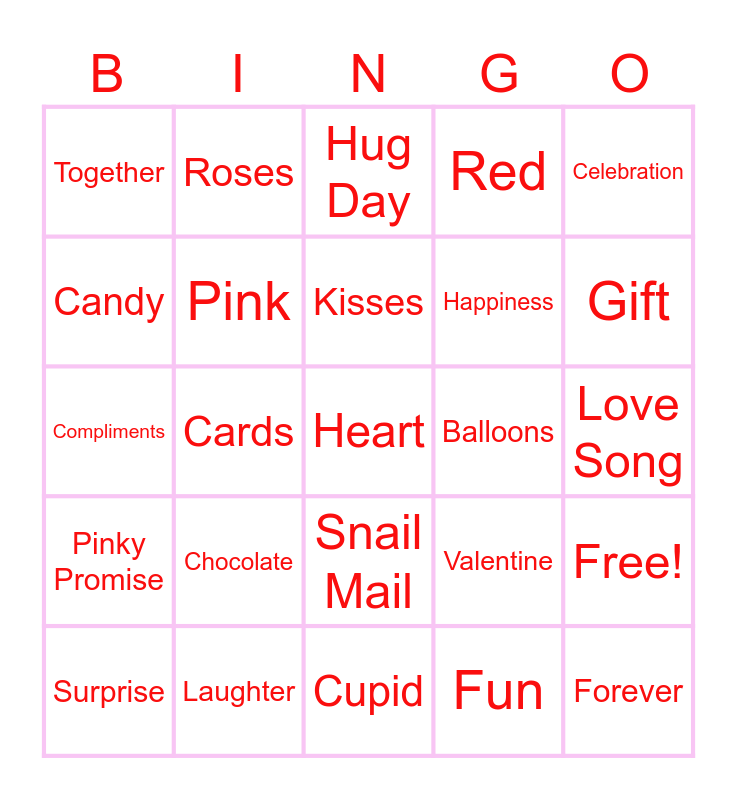 This bingo card has 51 words: Love, Heart, Friendship, Cupid, Chocolate, Hugs, Roses, Teddy Bear, Candy, Flowers, Pink, Red, Free!, Valentine, Kindness, Sweetheart, Kisses, Balloons, Love Letter, Celebration, Cards, Fun, Together, Happiness, Smile, Forever, Gift, Party, Surprise, Hug Day, Caring, Cute, Best Friends, Secret Admirer, Sharing, Laughter, Heartbeat, Special, Affection, Handwritten Note, Love Song, Pinky Promise, Thoughtful, Sweet Treats, Bouquet, Glitter, Compliments, Trust, Movie Night, Snail Mail and Valentine’s Day.