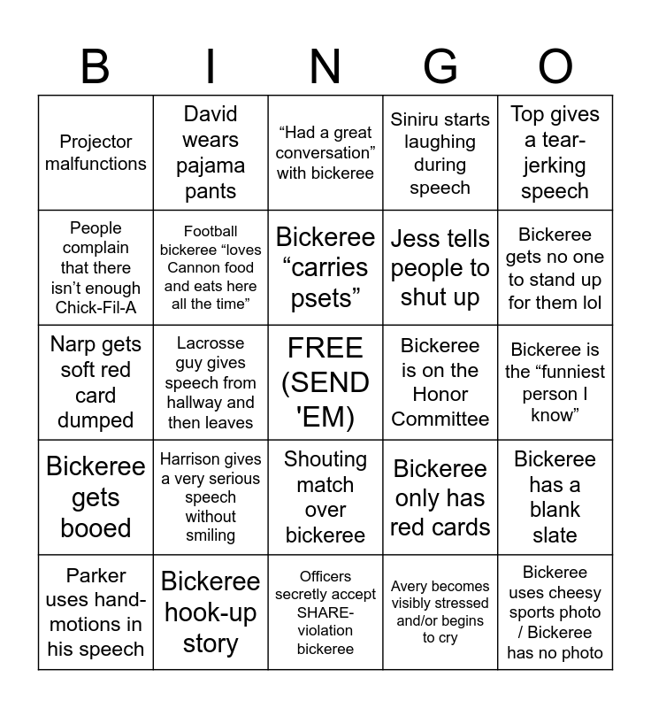 This bingo card has a free space and 24 words: Harrison gives a very serious speech without smiling, Bickeree hook-up story, Bickeree “carries psets”, Parker uses hand-motions in his speech, Top gives a tear-jerking speech, Projector malfunctions, People complain that there isn’t enough Chick-Fil-A, David wears pajama pants, Bickeree is on the Honor Committee, Shouting match over bickeree, Jess tells people to shut up, Narp gets soft red card dumped, Bickeree only has red cards, Bickeree has a blank slate, Football bickeree “loves Cannon food and eats here all the time”, Avery becomes visibly stressed and/or begins to cry, Bickeree is the “funniest person I know”, “Had a great conversation” with bickeree, Bickeree gets no one to stand up for them lol, Lacrosse guy gives speech from hallway and then leaves, Bickeree uses cheesy sports photo / Bickeree has no photo, Bickeree gets booed, Siniru starts laughing during speech and Officers secretly accept SHARE-violation bickeree.