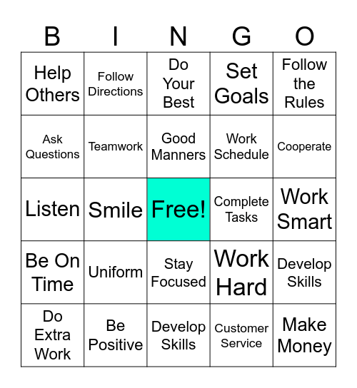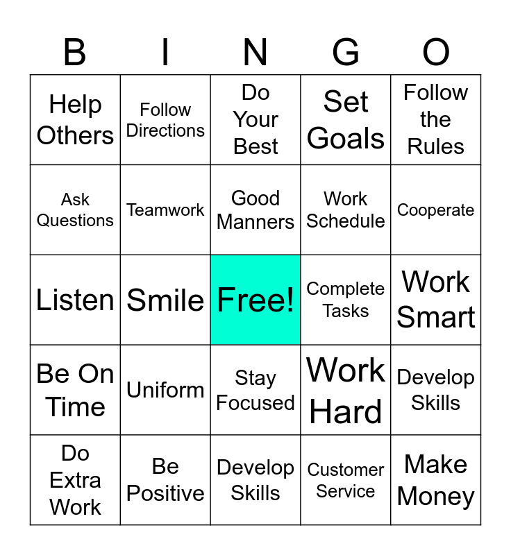 This bingo card has a free space and 24 words: Do Extra Work, Uniform, Good Manners, Customer Service, Follow the Rules, Help Others, Follow Directions, Do Your Best, Complete Tasks, Work Smart, Listen, Teamwork, Work Hard, Develop Skills, Ask Questions, Be Positive, Develop Skills, Set Goals, Cooperate, Be On Time, Smile, Stay Focused, Work Schedule and Make Money.