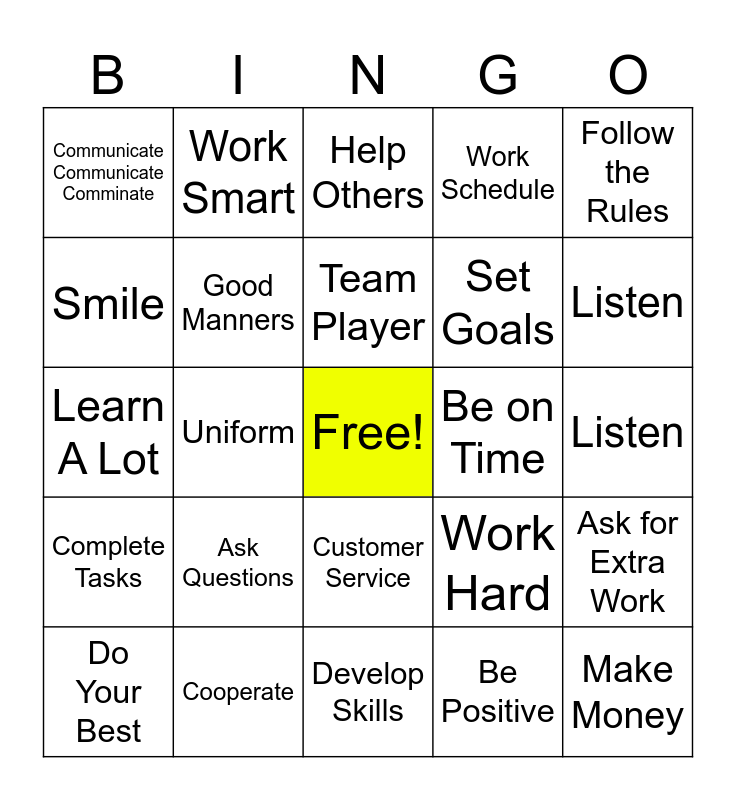 This bingo card has a free space and 24 words: Do Your Best, Ask Questions, Team Player, Be Positive, Follow the Rules, Communicate Communicate Comminate, Work Smart, Help Others, Be on Time, Listen, Learn A Lot, Good Manners, Work Hard, Ask for Extra Work, Smile, Cooperate, Develop Skills, Work Schedule, Listen, Complete Tasks, Uniform, Customer Service, Set Goals and Make Money.