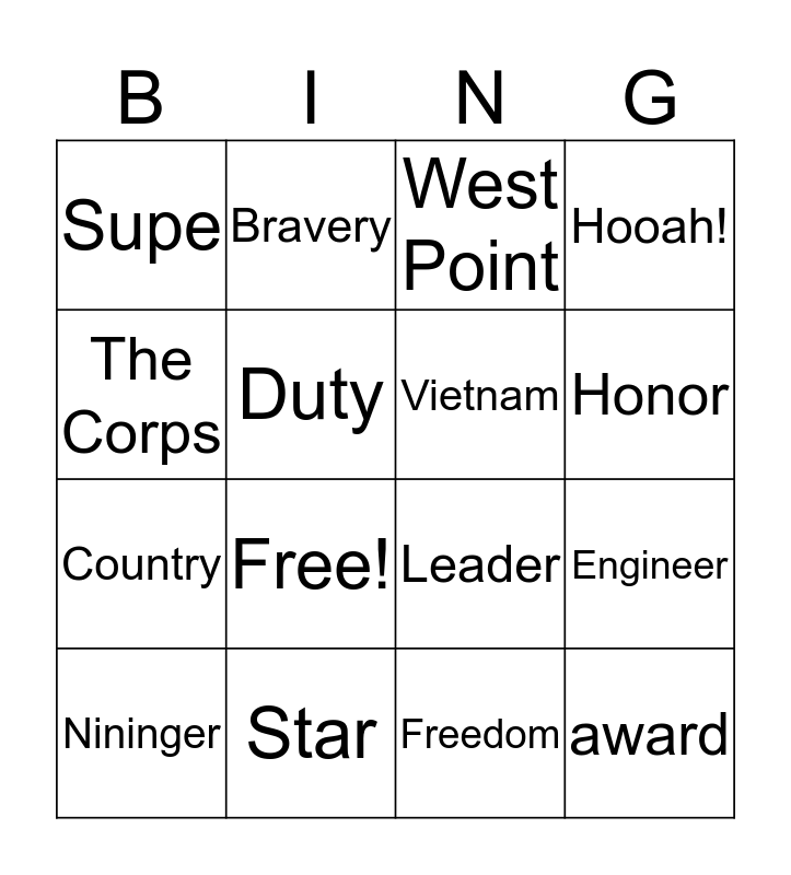 This bingo card has a free space and 15 words: Nininger, award, West Point, Supe, Honor, The Corps, Free!, Freedom, Duty, Country, Engineer, Hooah!, Vietnam, Bravery and Star.