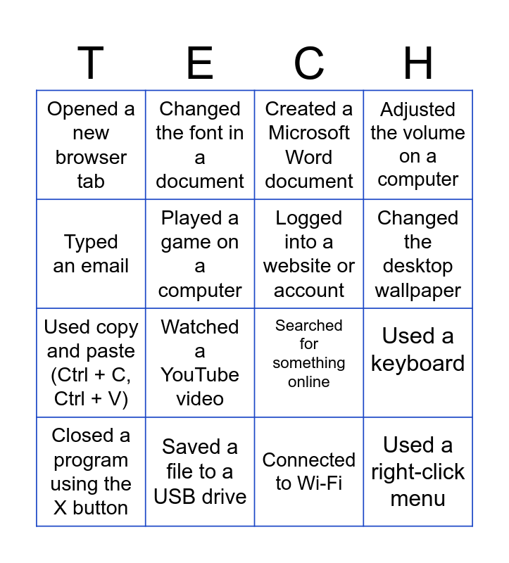 This bingo card has 20 words: Used a keyboard, Visited a website, Created a Microsoft Word document, Googled an image, Closed a program using the X button, Typed an email, Saved a file to a USB drive, Opened a new browser tab, Used copy and paste (Ctrl + C, Ctrl + V), Changed the font in a document, Watched a YouTube video, Searched for something online, Played a game on a computer, Used a right-click menu, Logged into a website or account, Took a screenshot, Changed the desktop wallpaper, Adjusted the volume on a computer, Connected to Wi-Fi and Used the undo function (Ctrl + Z).