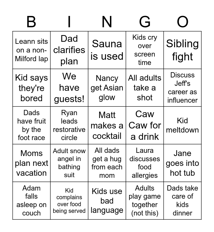 This bingo card has a free space and 24 words: Adult snow angel in bathing suit, Kid complains over food being served, Nancy get Asian glow, Adam falls asleep on couch, Sibling fight, Leann sits on a non-Milford lap, Kid says they're bored, Dad clarifies plan, Caw Caw for a drink, All dads get a hug from each mom, All adults take a shot, Dads have fruit by the foot race, Laura discusses food allergies, Jane goes into hot tub, We have guests!, Adults play game together (not this), Kid meltdown, Sauna is used, Discuss Jeff's career as influencer, Ryan leads restorative circle, Dads take care of kids dinner, Moms plan next vacation, Kids cry over screen time and Kids use bad language.