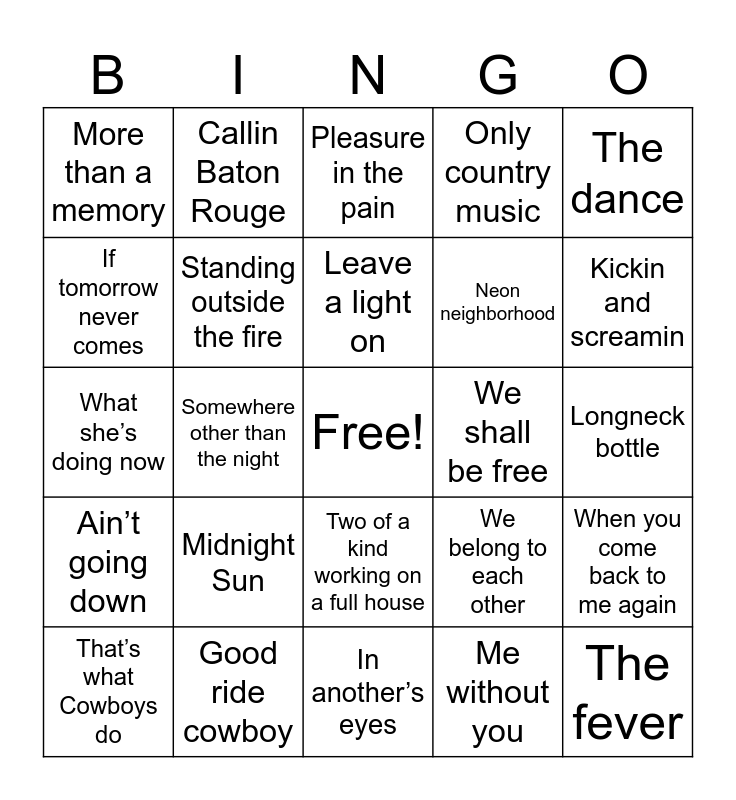 This bingo card has a free space and 54 words: The ship and the bottle, Ain’t going down, Friends in low places, Shameless, Two of a kind working on a full house, The beaches of Cheyenne, Only country music, Ask me how I know, If tomorrow never comes, Rodeo man, More than a memory, Shallow, Good ride cowboy, That’s what Cowboys do, Baby, let’s lay down in dance, In another’s eyes, The fever, Neon neighborhood, Learning to live again, Longneck bottle, We belong to each other, Dive bar, We shall be free, The dance, Message in a bottle, Callin Baton Rouge, Weekend, Two piña coladas, That Summer, Me without you, The River, Beer run, All day long, Unanswered prayers, Pleasure in the pain, Much too young, What she’s doing now, When you come back to me again, Workin for livin, Standing outside the fire, The thunder rolls, To make you feel my love, Papa loved mama, Rodeo, Midnight Sun, American honky-tonk bar association, The change, Wrapped up in you, Leave a light on, Somewhere other than the night, Kickin and screamin, Walking after midnight, The night I called the old man out and Squeeze me in.