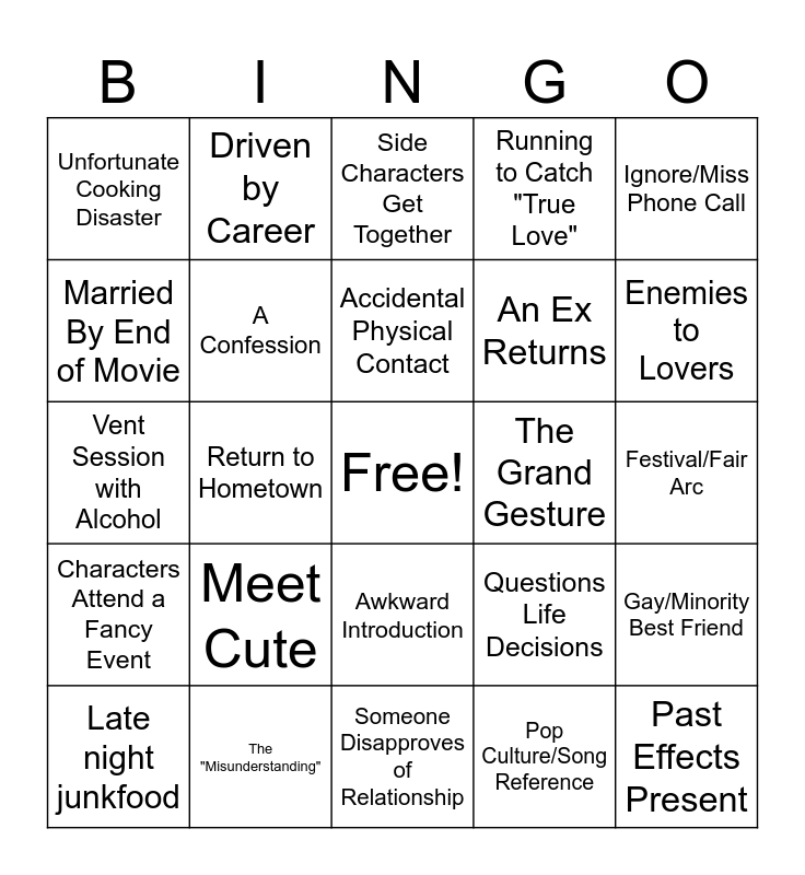 This bingo card has a free space and 24 words: Meet Cute, The "Misunderstanding", Accidental Physical Contact, Late night junkfood, Ignore/Miss Phone Call, Unfortunate Cooking Disaster, Married By End of Movie, Driven by Career, The Grand Gesture, Awkward Introduction, An Ex Returns, Vent Session with Alcohol, Questions Life Decisions, Gay/Minority Best Friend, A Confession, Pop Culture/Song Reference, Festival/Fair Arc, Side Characters Get Together, Enemies to Lovers, Return to Hometown, Past Effects Present, Characters Attend a Fancy Event, Running to Catch "True Love" and Someone Disapproves of Relationship.