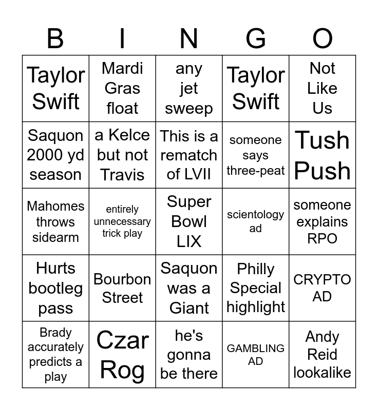 This bingo card has a free space and 24 words: Bourbon Street, Czar Rog, This is a rematch of LVII, Brady accurately predicts a play, Not Like Us, Taylor Swift, Saquon 2000 yd season, Mardi Gras float, scientology ad, Saquon was a Giant, someone says three-peat, Mahomes throws sidearm, Philly Special highlight, CRYPTO AD, a Kelce but not Travis, GAMBLING AD, someone explains RPO, any jet sweep, Tush Push, entirely unnecessary trick play, Andy Reid lookalike, Hurts bootleg pass, Taylor Swift and he's gonna be there.