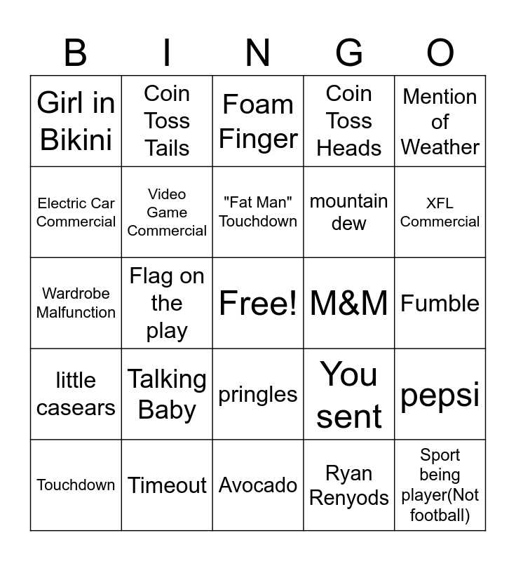 This bingo card has a free space and 74 words: Sideline Takedown(Not Player), Mascot, Foam Finger, American Flag, Team Fight, Movie or TV Show Preview, Missed Field Goal, Touchdown, Touchdown, Fast Food Commercial, Superhero in Commercial, End zone Dance, "Fat Man" Touchdown, Electric Car Commercial, "play Under Review", Flag on the play, 4th down Conversion, XFL Commercial, "Accent", Wardrobe Malfunction, Video Game Commercial, Coin Toss Tails, Coin Toss Heads, Local Commercial, Sport being player(Not football), "Talk to your Doctor", "Alexa", Foreign Car Commercial, American Car Commercial, Disney Character, Mention of Weather, Celeb in Crowd, NFL Players not playing in game, Reference to movie older than 2005, Morgan freeman, Ryan Renyods, Clydesdale, Puppy, Monkey, "Arial Coverage provided by", Avocado, Timeout, Timeout, Tied Score(not 0-0), Reference to Previous Injury, Girl in Bikini, Talking Animal, Talking Baby, Beer Commercial, Challenge Play Called, Coach Covering His Mouth, Interception, Fumble, Fumble, Snoop Dogg, You sent, pringles, tiktok, coke, pepsi, mountain dew, Gieco, little casears, doritos, M&M, bose, You sent, tacobell, You sent, female rapper, Team Fight, Robot, Chic fil a and AT&T.